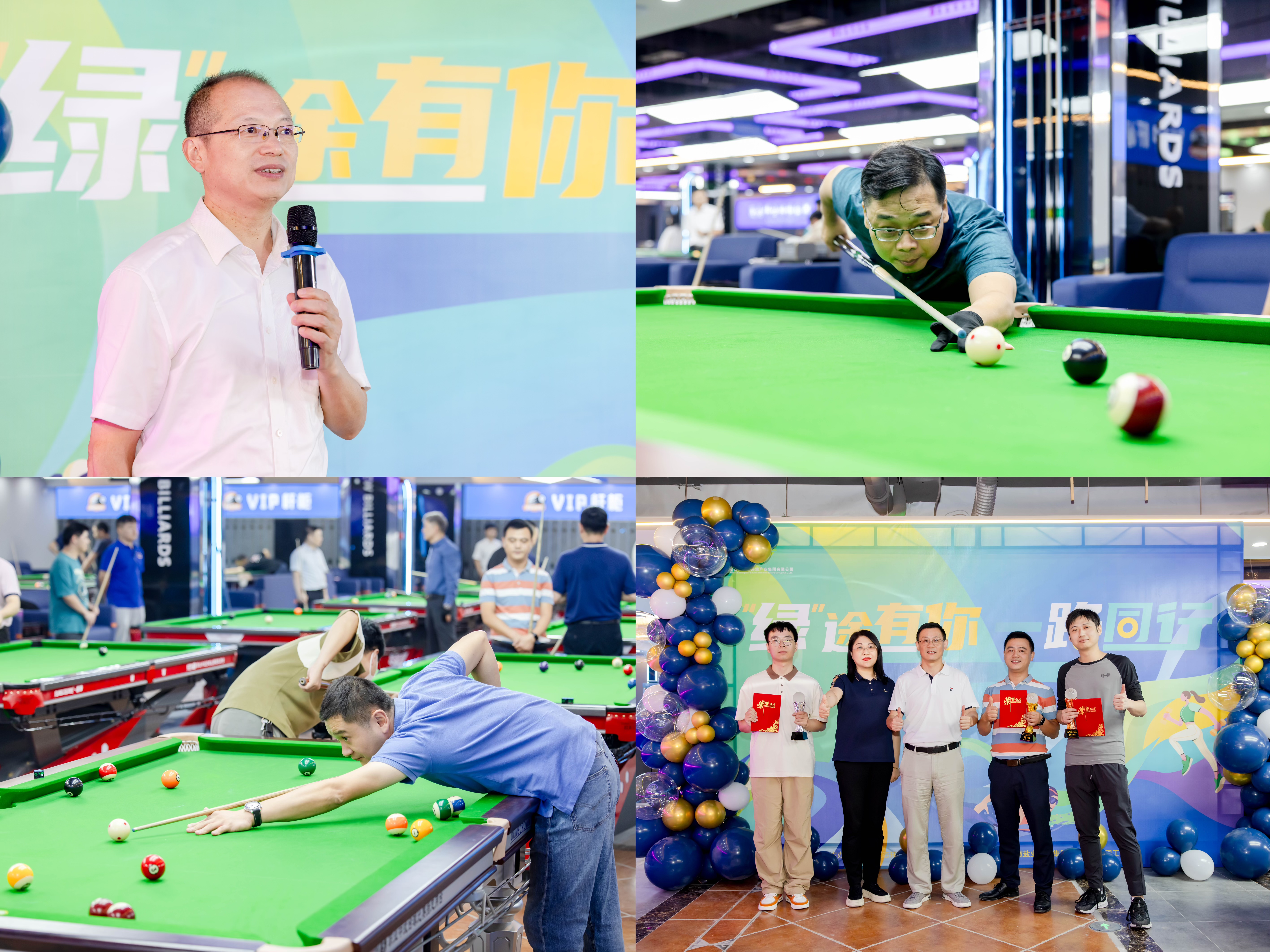 在熱烈慶祝中華人民共和國成立75周年、安徽省生態環境產業集團掛牌組建一周年之際,為營造歡慶氛圍,凝聚干事創業正能量,9月29日下午,省生態環境集團“‘綠’途有你,一路同行”系列主題文體活動正式拉開帷幕,第二屆“徽鹽地產杯”臺球比賽在合肥濱湖成功舉辦,集團公司黨委副書記張小忠出席開幕式并致辭,集團公司黨委委員、紀委書記羅守斌出席活動并為比賽開球,來自集團公司本部及所屬各單位50余名臺球愛好者踴躍參賽。