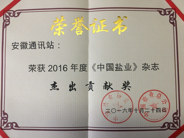近日,在中國鹽業總公司和中國鹽業協會組織的《中國鹽業》雜志2016年度先進通訊站評選中,安徽鹽業通訊站榮獲杰出貢獻獎。