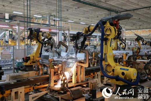 江汽集團生產(chǎn)線。圖為機器人正在進行焊接。人民網(wǎng) 王曉飛攝