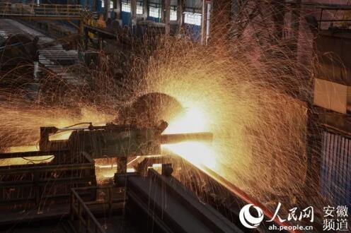 鋼材切割時,四濺的火星猶如一幅畫。圖為馬鋼H型鋼生產(chǎn)線。人民網(wǎng) 王曉飛攝