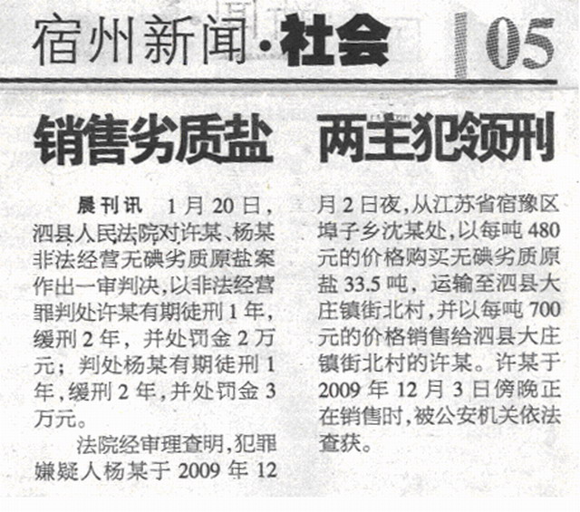 《皖北晨刊》:銷售劣質(zhì)鹽 兩主犯領(lǐng)刑