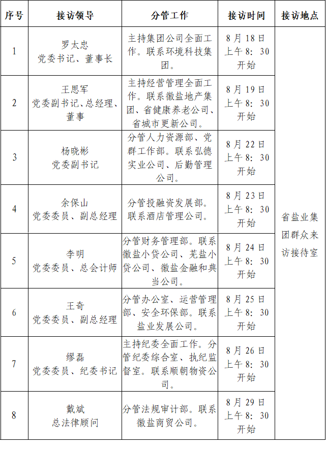 根據工作安排,現就省鹽業集團領導班子成員8月份接待省鹽業系統職工群眾來訪安排公示如下: