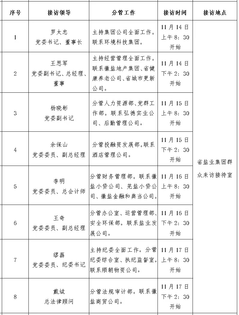 根據(jù)工作安排,現(xiàn)就省鹽業(yè)集團領(lǐng)導(dǎo)班子成員11月份接待省鹽業(yè)系統(tǒng)職工群眾來訪安排公示如下: